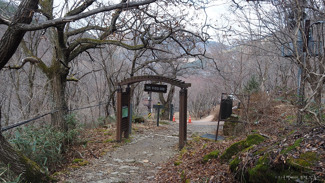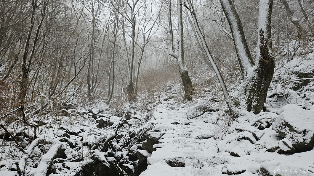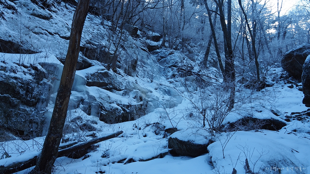 상부 1km 정도는 겨울에 온통 얼어서 빙판길이 되어 있는 곳인데 오늘은 전날 내린 눈으로 빙판길에 눈이 덮여서 다행히 크게 미끄럽지는 않습니다.