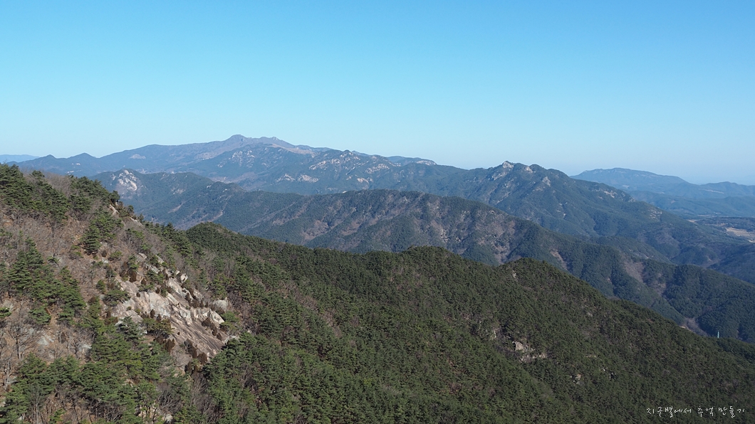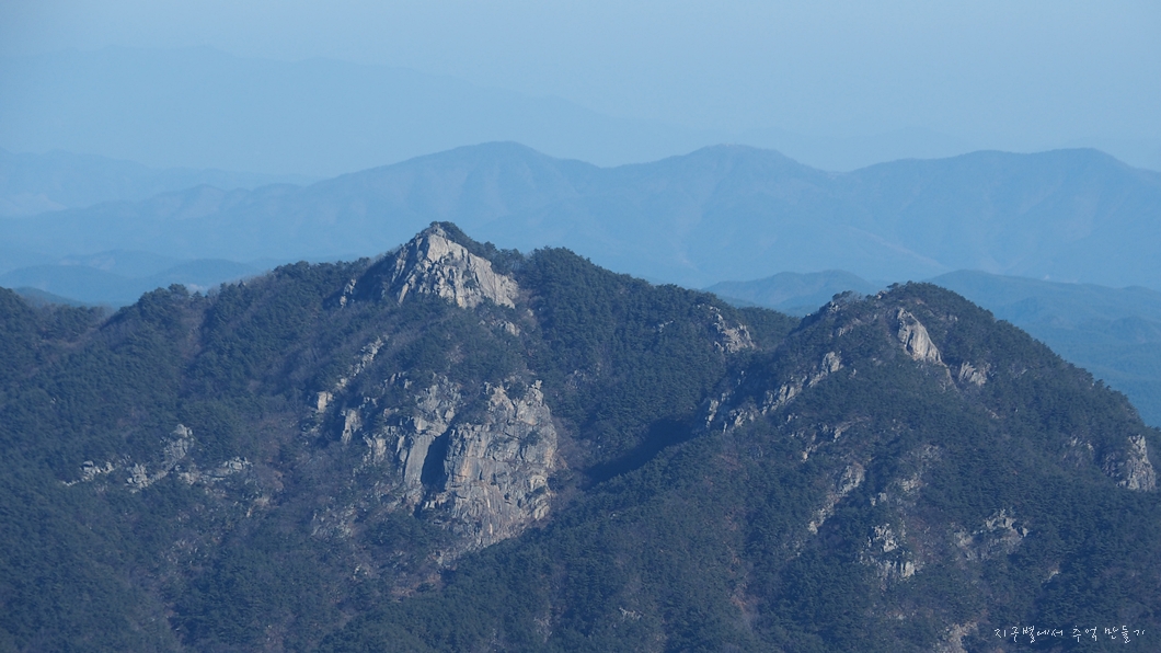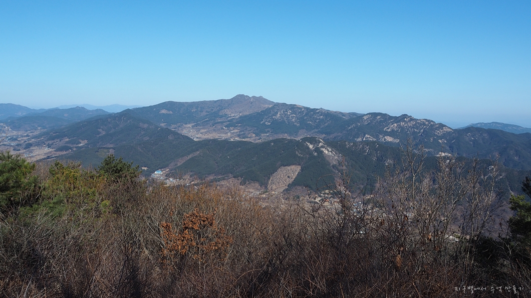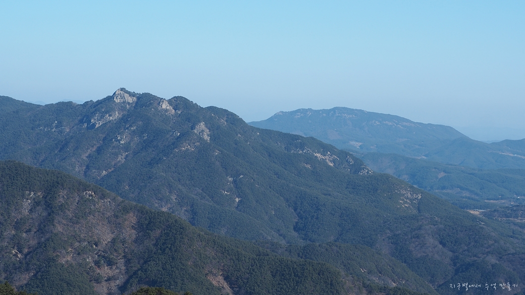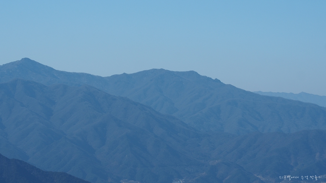 신원의 월여산과 그 뒤 흰대미, 수도, 단지봉 능선이 이어집니다.
