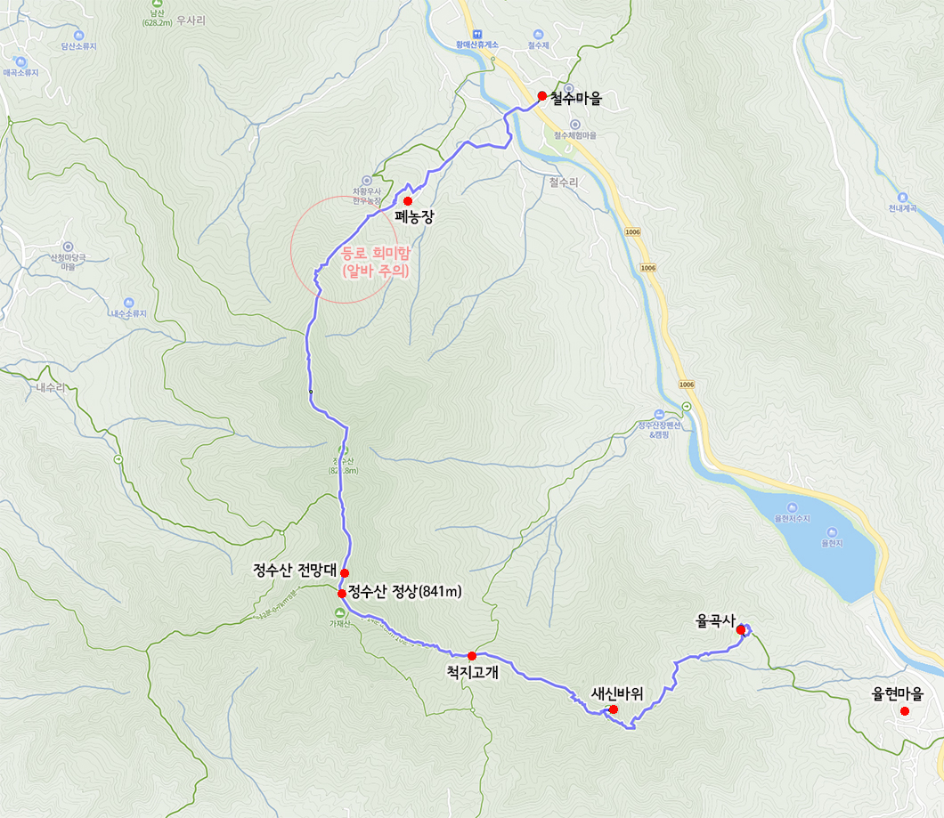 율곡사에서 정상까지는 등산로가 별 문제없으나 내수리 갈림길 지나고부터 철수마을까지는 잡목, 넝쿨이 많고 등산로도 잘 보이지 않아 주의해야 합니다.