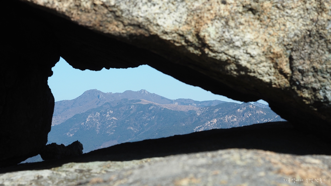 새신바위 상단 포개진 바위 사이로 보이는 황매산.