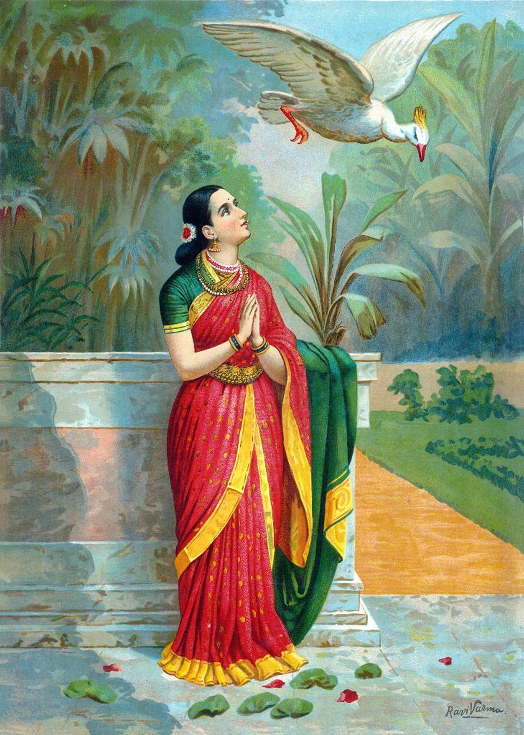 Damayanti는 Mahabharata의 Vana Parva 책에 나오는 사랑 이야기의 캐릭터입니다. 그녀는 비다르바 왕국의 공주였으며 니샤다 왕국의 날라 왕과 결혼했습니다. 여기에서 다마얀티는 결혼 전 사랑하는 사람을 그리워하는 모습을 보여주는 장면이구요.