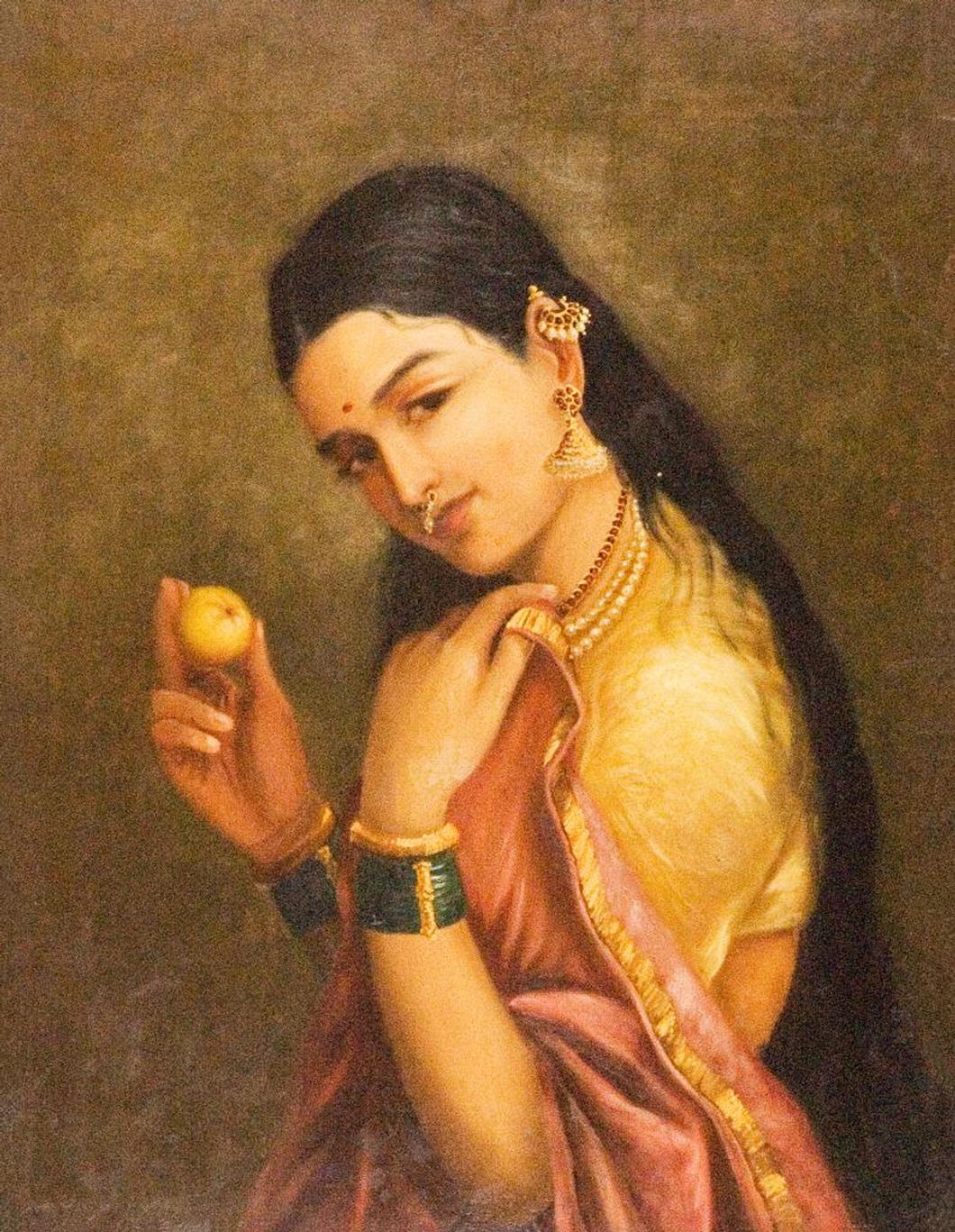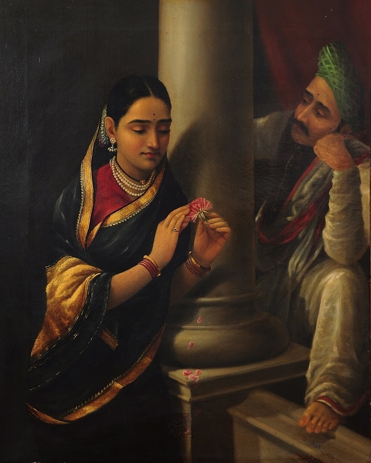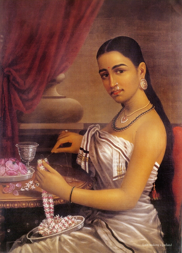 전통 의상을 입고 재스민 꽃으로 화환을 짜는 등 일상적인 생활을 하고 있는 여성의 모습입니다. 이 그림들은 매우 인기가 높았으며 Ravi Varma를 당대의 주요 화가로 자리매김하는 데 큰 역할을 했다고 하네요.