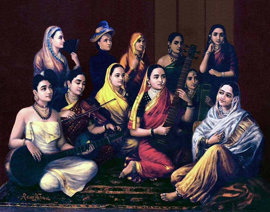 다양한 인도 여성들이 전통 악기를 연주하는 모습을 보여줍니다. 이 그림에는 무슬림 창녀, 비나 역을 맡은 Nair여성, 중앙의 Marathi여성 등 다양한 여성층이 전통 의상을 입고 있는 모습이 묘사되어 있습니다.