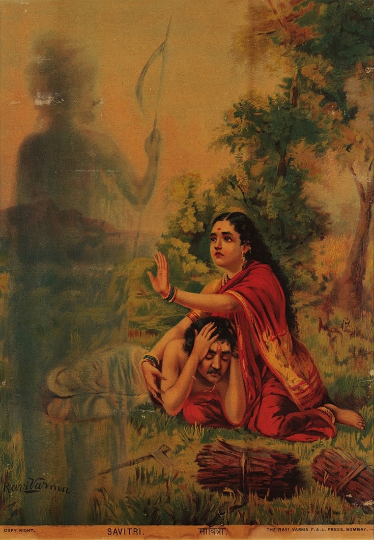 사비트리(Savitri)는 아쉬와파티왕과 말라티 왕비 사이의 딸 사비트리가 왕국을 잃고 아버지와 함께 숲에서 나무꾼으로 살고 있던 왕자 사티야반을 만나 사랑에 빠진 이야기가 담겨 있습니다. 이 그림은 단식을 하던 사비트리가 죽음의 신 야마가 사티아반의 목숨을 빼앗지 못하도록 말다툼을 벌이고 만류하는 순간을 담고 있는 장면이구요.