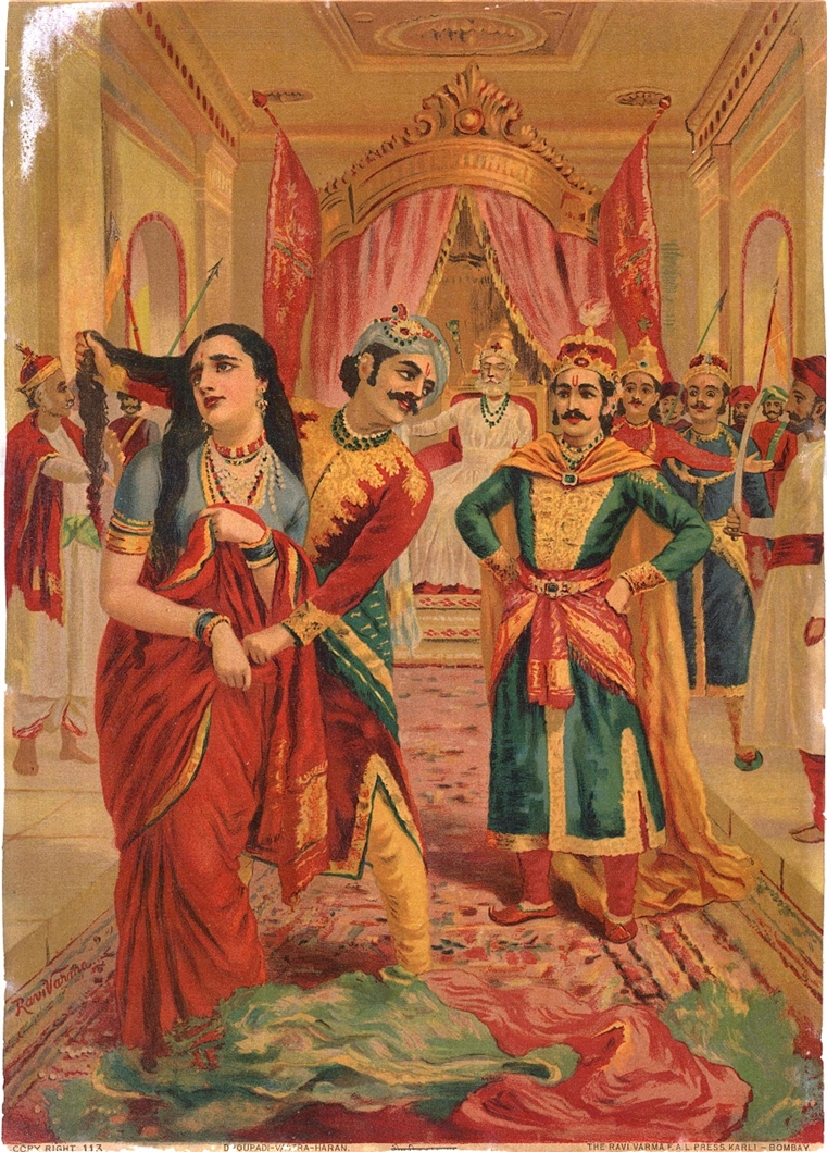 인도 서사시 마하바라타(Mahabharata)의 한 장면을 묘사한 것으로서 판다바(Pandavas)의 아내 드라우파디(Draupadi)가 카우라바(Kauravas) 궁정에서 두사사나(Dussasana)에 의해 옷을 벗는 장면입니다. 그림은 고통에 빠진 드라우파디가 자비를 간청하고 있지만 두사사나가 그녀의 옷을 억지로 벗기는 모습을 보여줍니다.