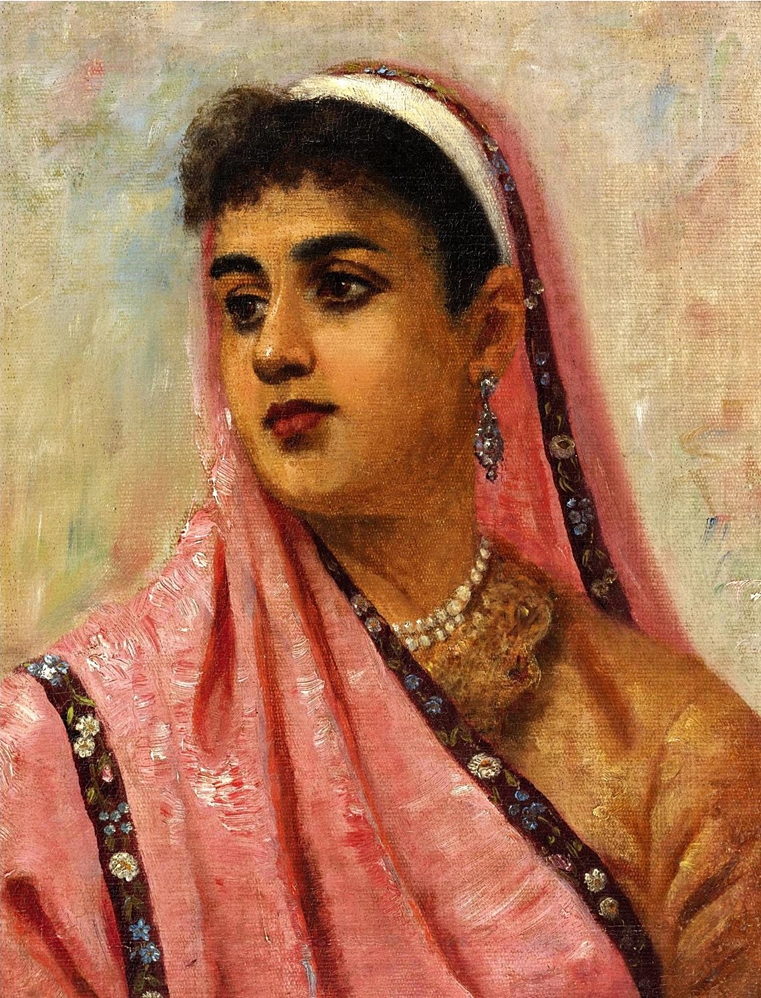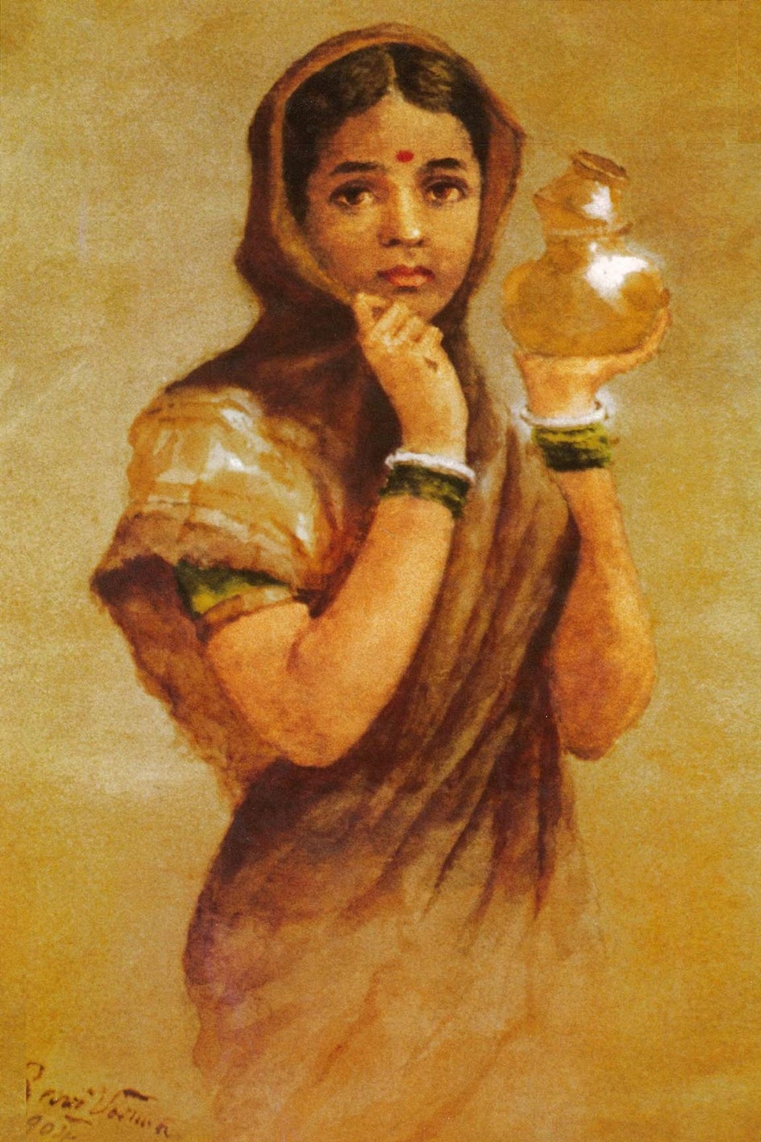 1904년에 그려진 "The Milkmaid"라는 제목의 이 작품은 전통 복장을 한 인도 여성의 고요하고 매혹적인 묘사를 보여주는 작품으로서 20세기 초 인도의 중산층 여성의 모습을 볼 수 있습니다.