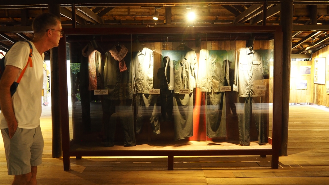 북한의 인민복과 비슷한 크메르 루주의 복장이 유리관 안에 전시되어 있네요.