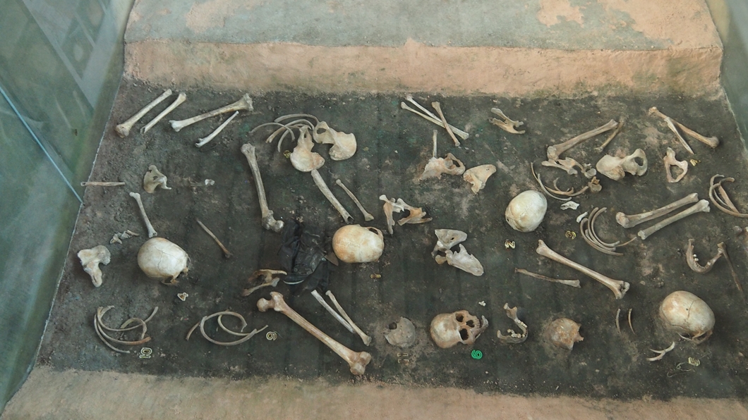 유리창 안에는 두개골을 비롯한 대퇴부 뼈들이 쌓여 있습니다.