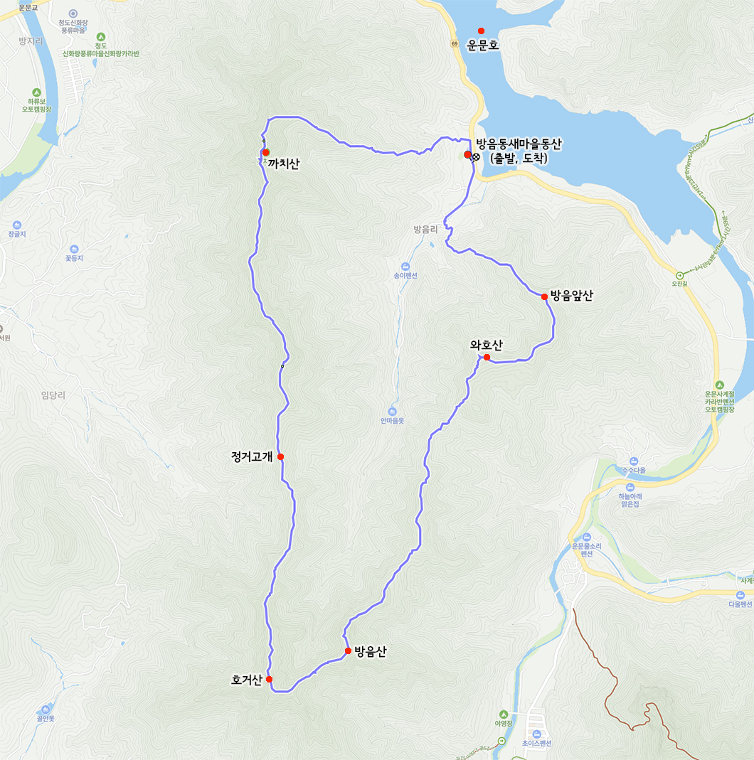 산행은 운문댐 옆에 자리한 방음동 새마을 동산에서 출발하여 까치봉에 오르고 그 뒤로는 능선을 타고 남쪽으로 걸어서 호거산, 방음산, 와호산을 거쳐 능선을 한 바퀴 빙 돌아서 제자리로 내려오게 됩니다.