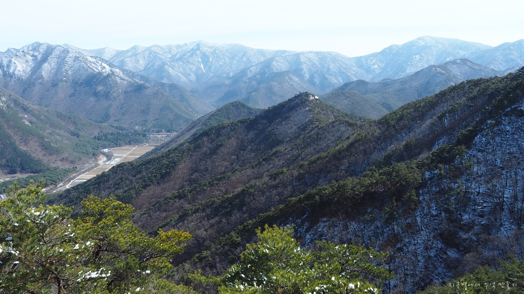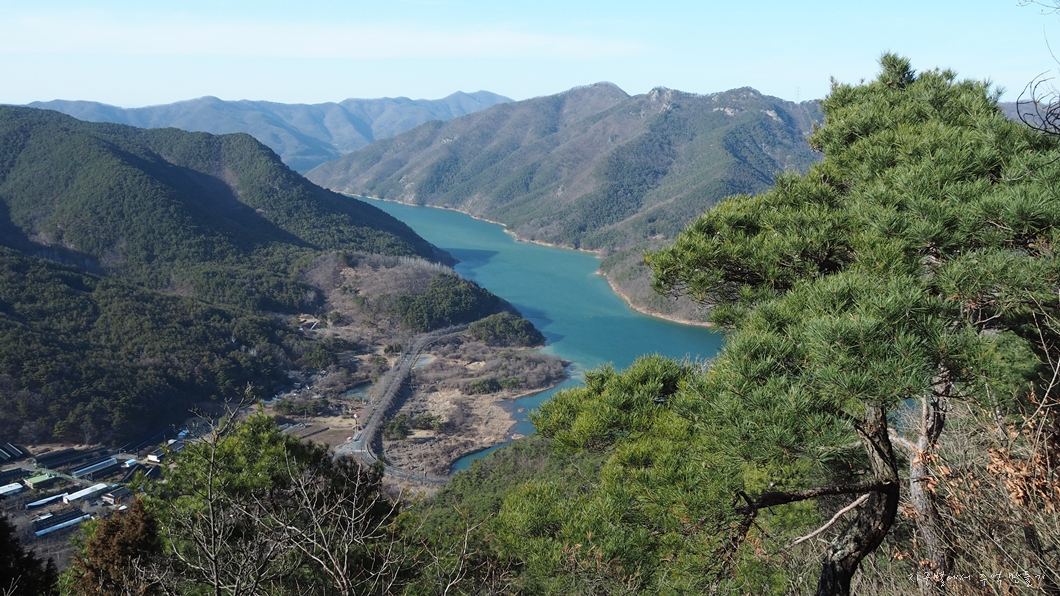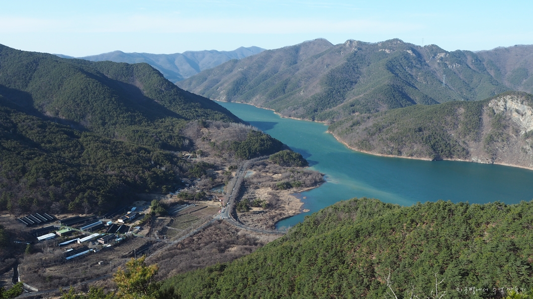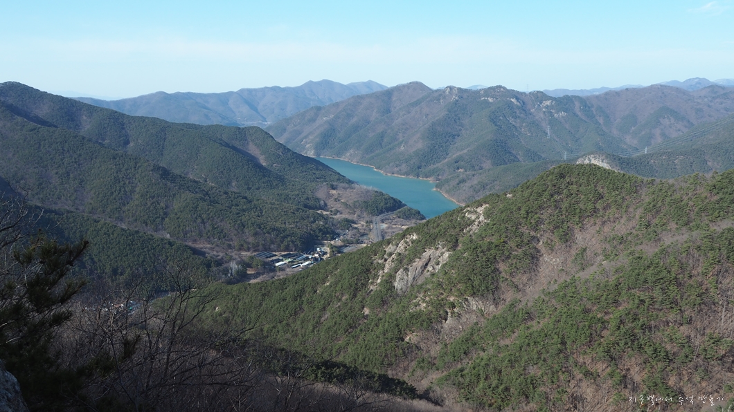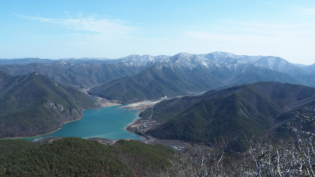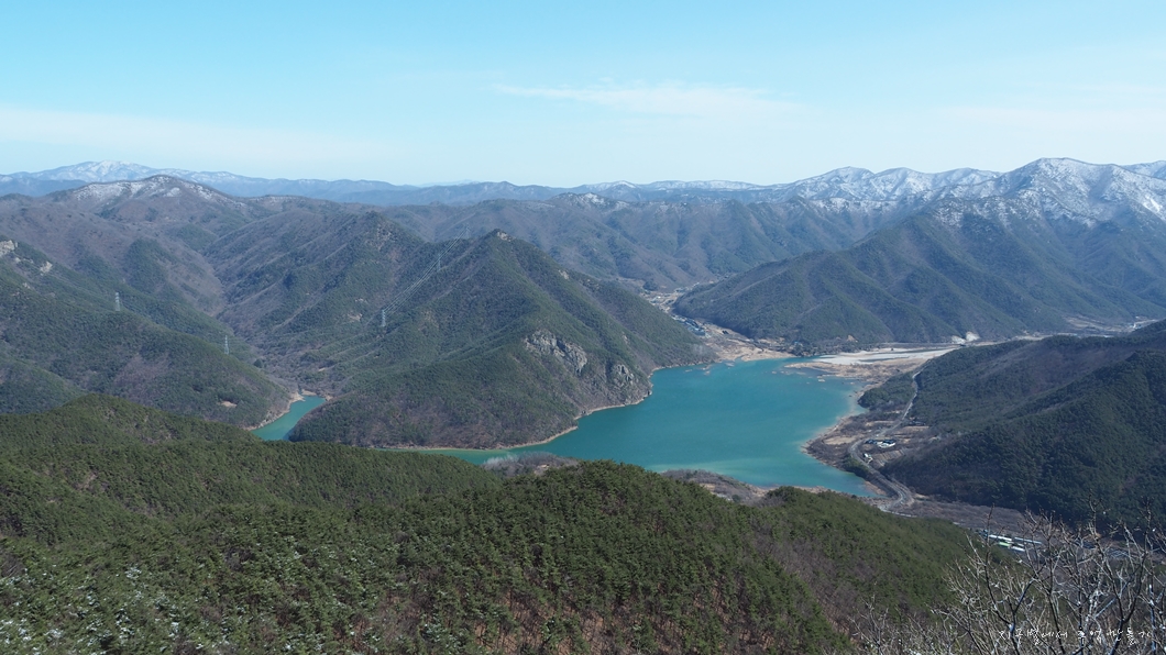 좌측 뒤로 단석산과 토함산이 설산으로 보이고 우측 운문댐 상류쪽으로는 눈이 덮여있는 옹강산과 문복산도 가까이 보입니다.
