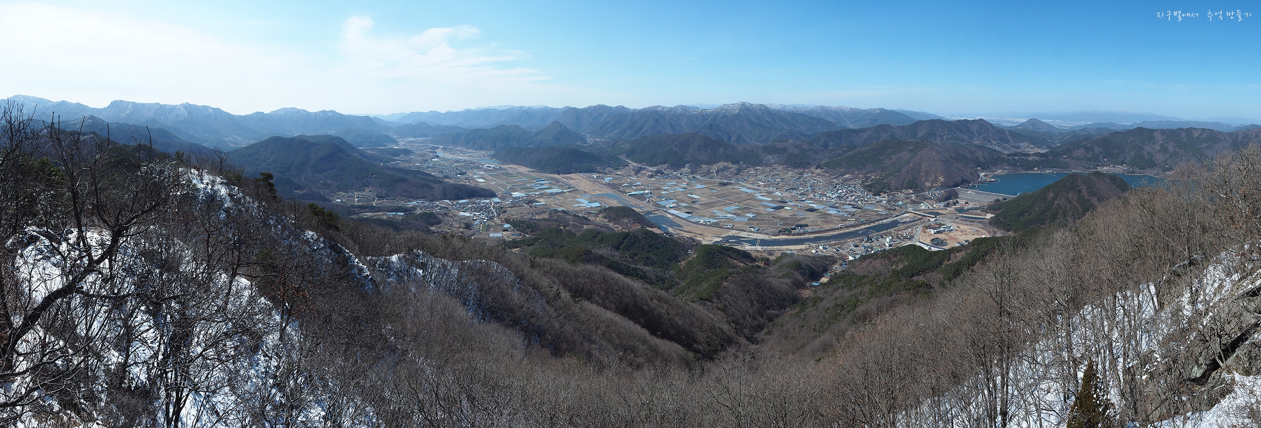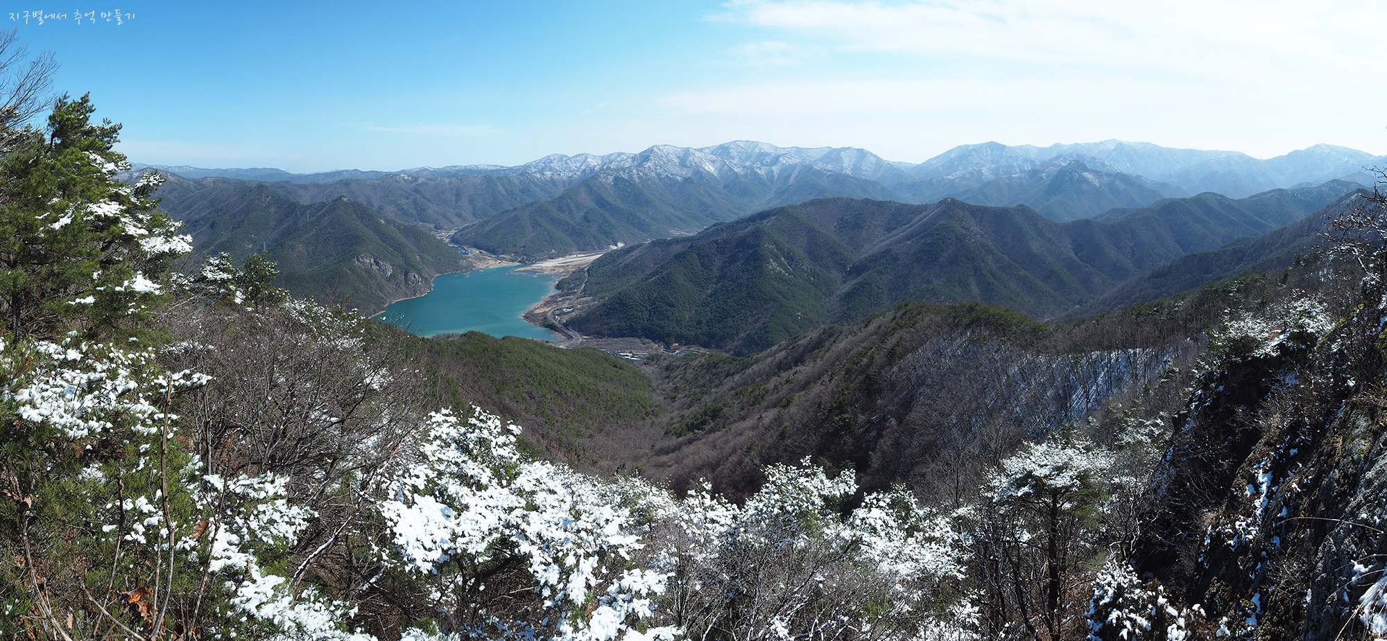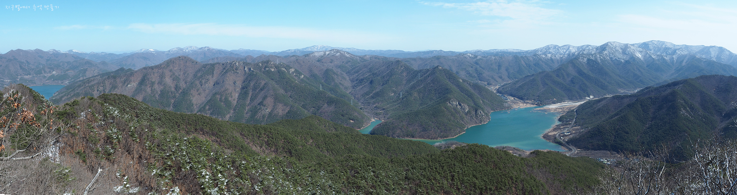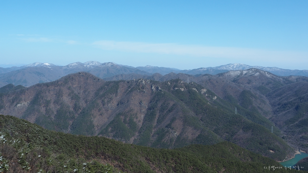 좌측 뒤로 단석산과 토함산이 설산으로 보이고 우측 운문댐 상류쪽으로는 눈이 덮여있는 옹강산과 문복산도 가까이 보입니다.