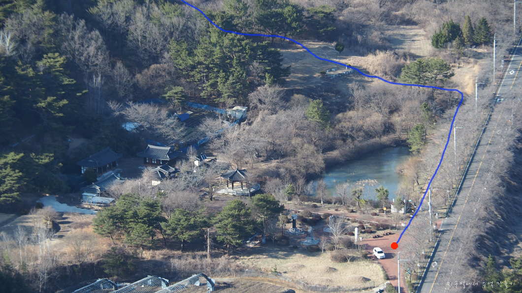 빨간색 점이 찍힌 곳이 새마을동산이고 그곳에서 도로 옆 임도를 따라 100여 m 가다가 좌측 산길로 오르면 됩니다.