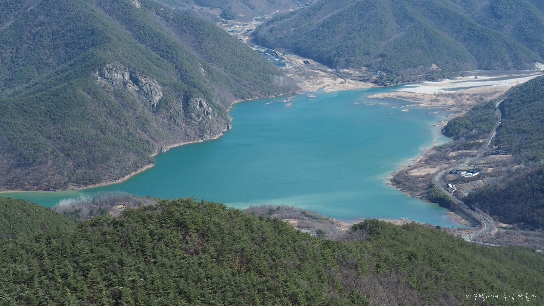 정상에서 내려다보는 운문호의 풍경은 한 폭의 그림입니다.