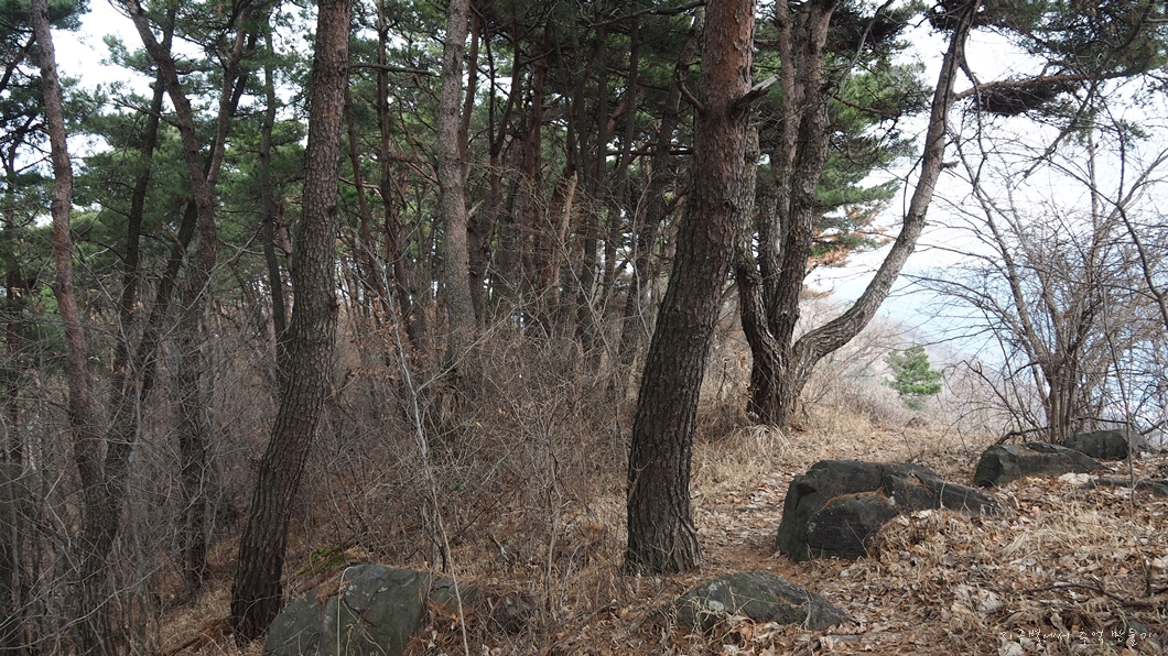 소나무들이 적당하게 서 있는 능선길을 올라서 20여분 정도 더 걸어가야 정상입니다.