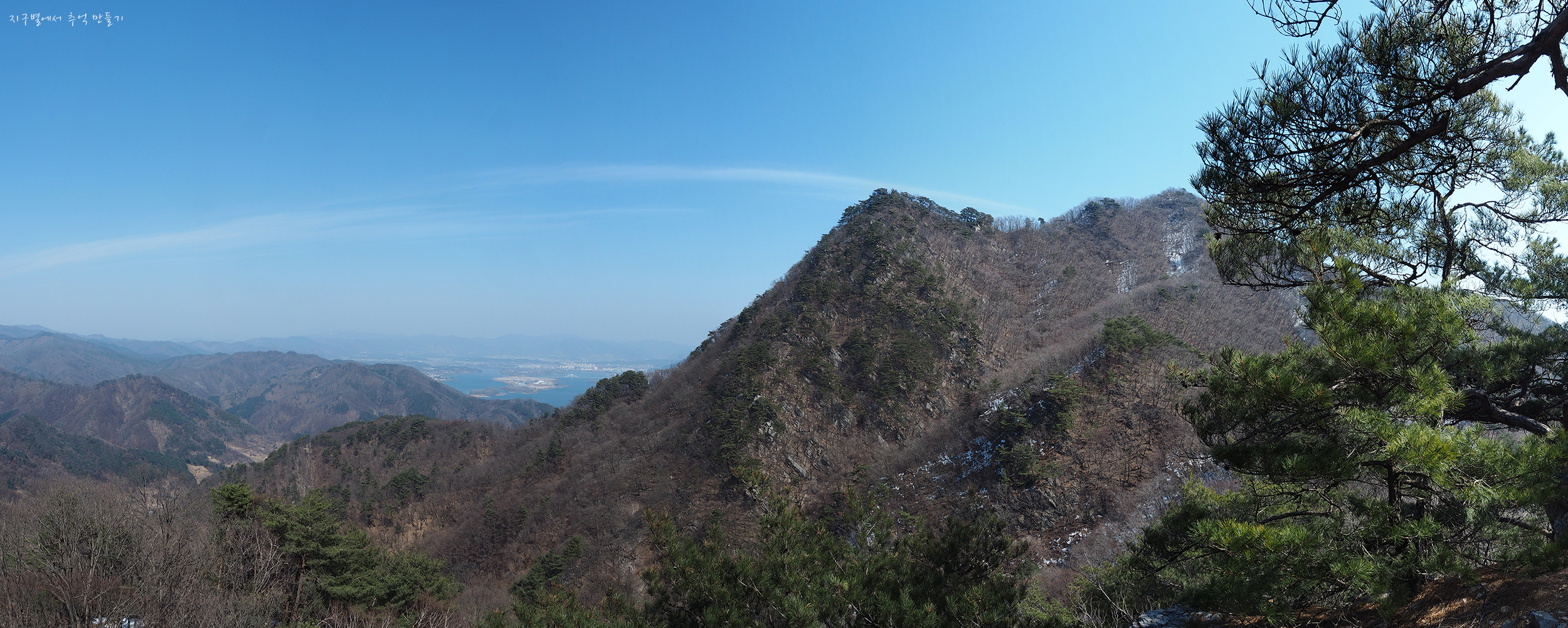 앞쪽 용화봉과 춘천시가지가 내려다보이는 파노라마.