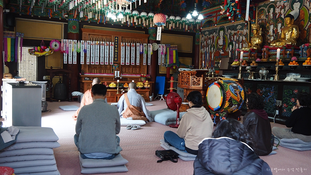 난 등산화 벗기 귀찮아 바깥에 서 있고 지율군 지폐 두장을 손에 쥐어주고 부처님께 인사를 드리라고 했습니다.