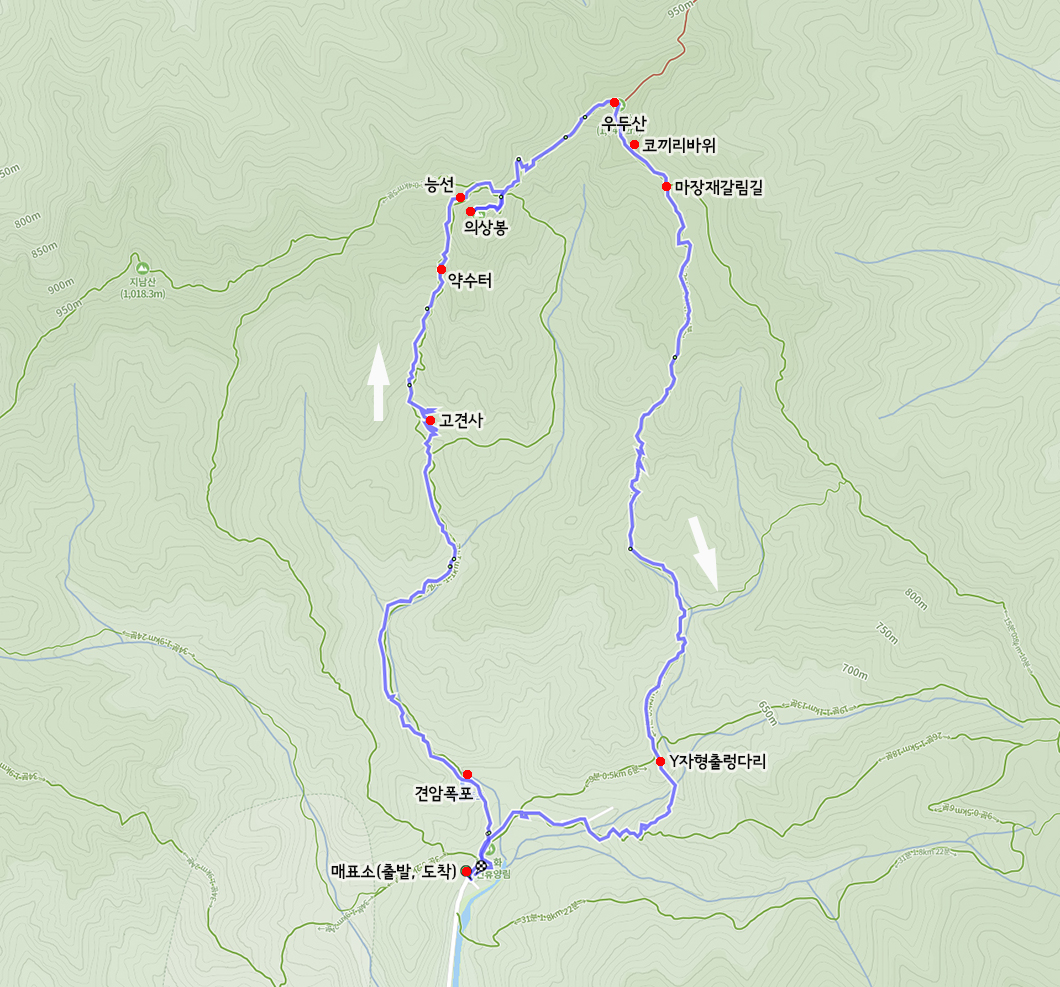 산행 코스 : 매표소 - 고견사 - 의상봉 - 우두산 - Y자 출렁다리 - 매표소(원점회귀)