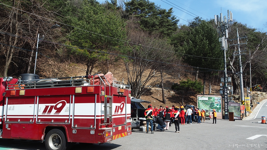 우두산 입구에 도착하니 119에서 소방 캠페인을 벌이고 있네요.
