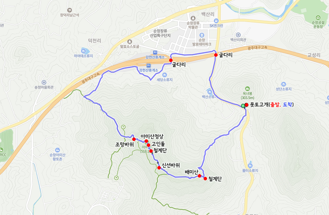 산행 코스 : 못토고개 - 배미산 - 아미산 - 순창고추장마을 - 못토고개(원점회귀)