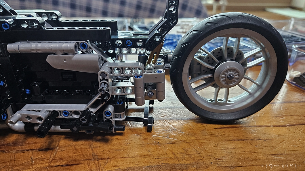 조립하면서 알게 된 것인데 앞바퀴 방향 회전은 핸들로 바로 전달이 되는 게 아니고 한번 더 커넥팅을 거쳐 핸들로 연결이 됩니다.
