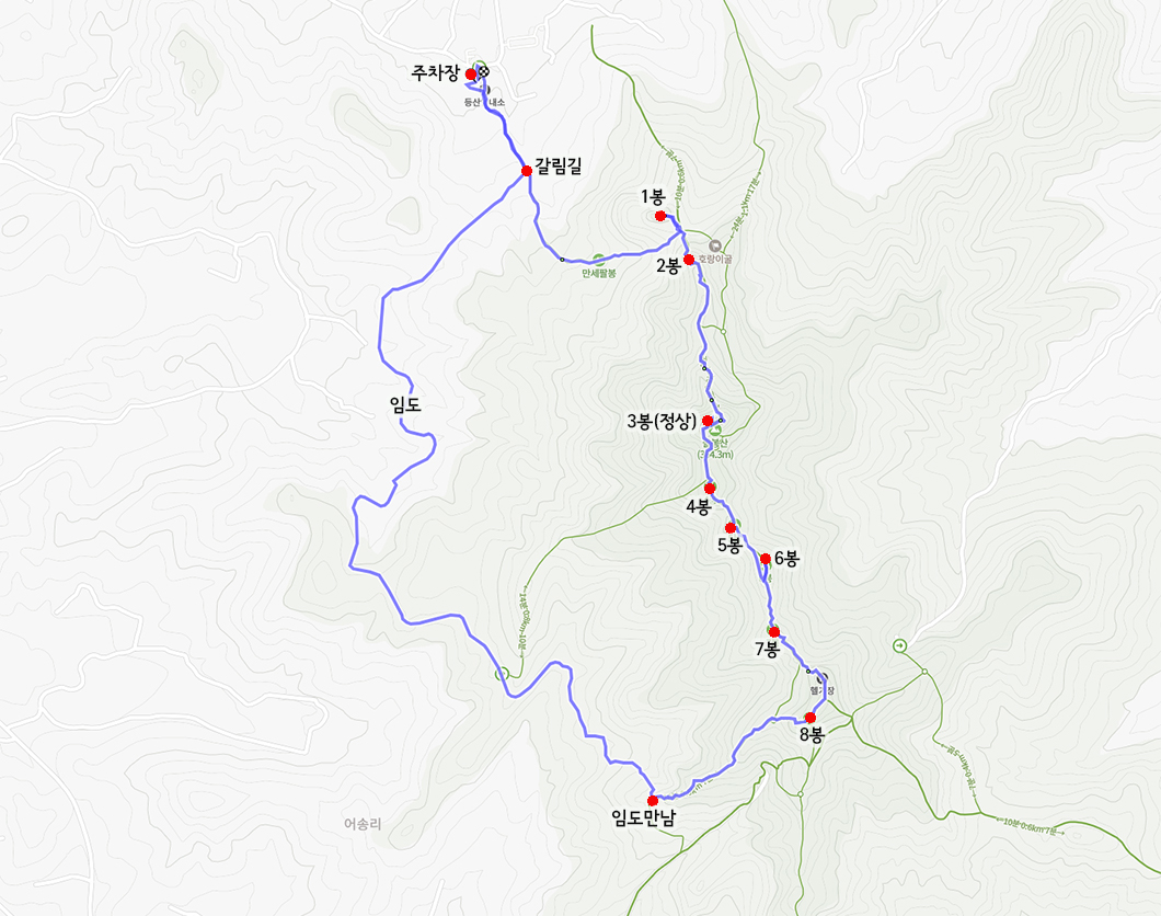 산행 코스 : 양길주차장 - 1봉~8봉 - 임도 - 양길 주차장(원점회귀)