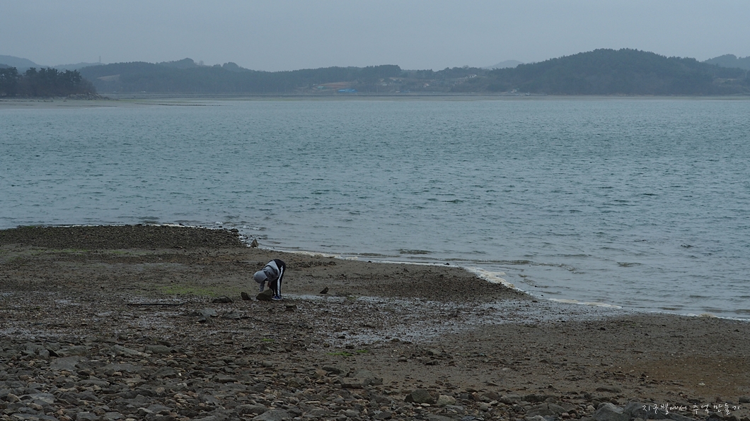 지율이는 바람이 세차게 부는 바닷가에서 게를 잡고 있네요.