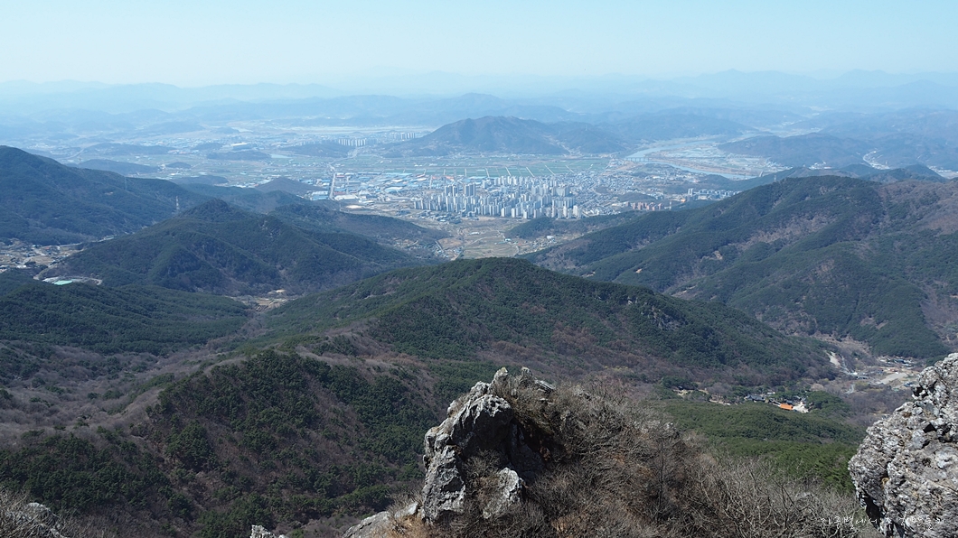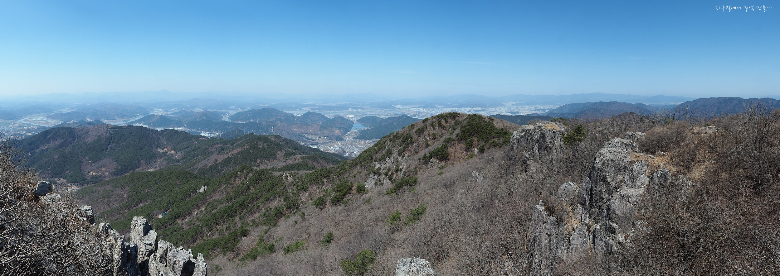 멀리 경남 서부 지역의 산들과 대구 달서구 쪽 조망의 파노라마.