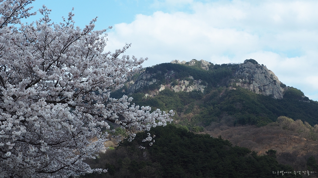 벚꽃과 금성산 정상의 바위듬 풍경