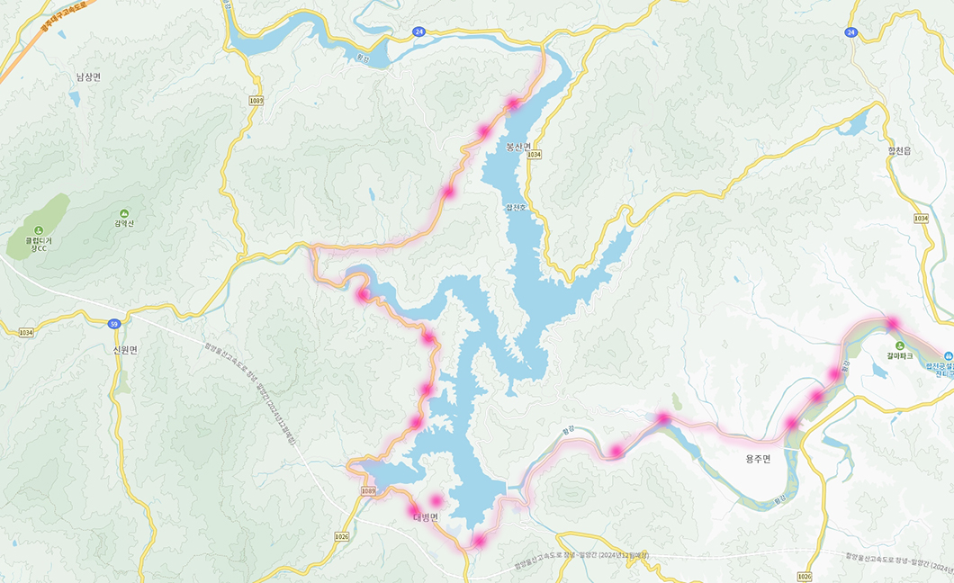 합천 백리벚꽃길은 합천 읍내를 지나 1026번 지방도로를 따라 합천댐, 대병면과 봉산면을 지나는 합천호 드라이브 호반도로를 말한답니다.