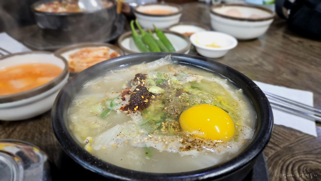 섬에서 나와 모슬포 바닷가에 바짝 붙어 있는 호텔에서 낮술하고 해장하러 가서 먹은 해장국.