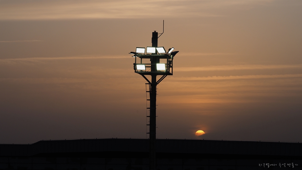 배가 부두에 도착하고 하선을 하는데 터미널 지붕 위로 해가 솟아오르네요.
