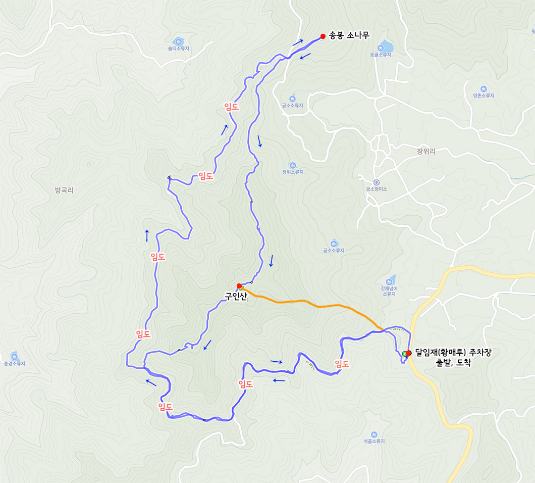 산행 코스 : 달음재 주차장 - 임도 - 송봉(소나무) - 산길로 구인산까지 - 임도 - 주차장(원점회귀)