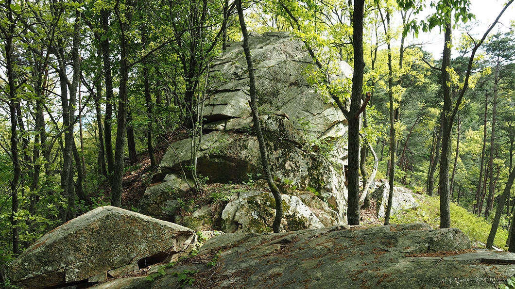 중간에 커다란 바위가 솟아 있어 올라가면 조망이 조금 트이려나 하여 낑낑 올라갔는데..