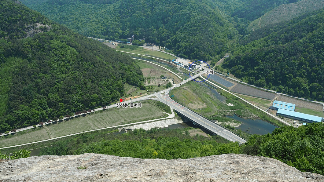 제 차를 주차를 해 둔 곳(파란 원)과 상사봉 들머리가 내려다보이네요.