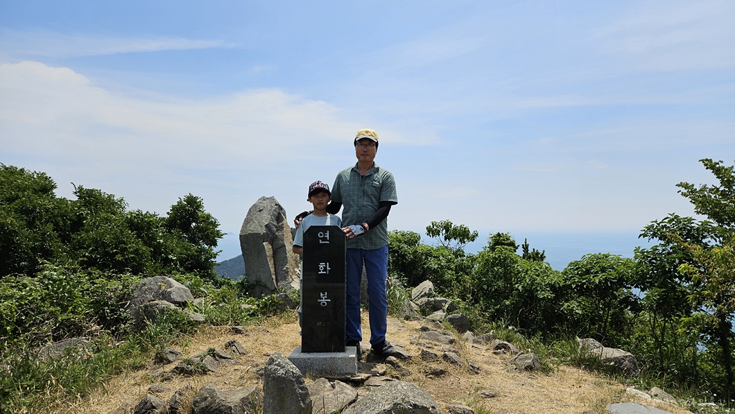 정상에서는 용머리해안이 내려다보이고 용머리 끝 뒤로 매물도, 우측으로는 국도섬이 보이네요.