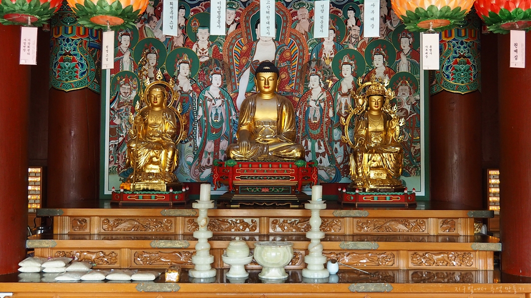 주불전인 대웅전에는 중앙에 아미타불이 좌우 호위불로는 지장보살과 관세음보살이 봉안되어 있습니다.