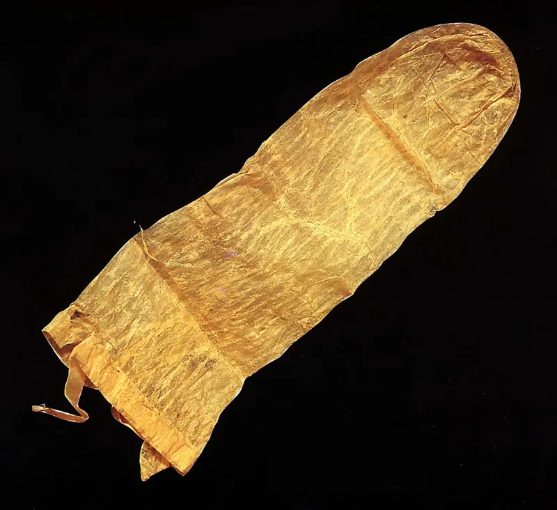돼지 창자로 만든 이 재사용 가능한 콘돔은 1640년 스웨덴 룬드에서 발견되었습니다.