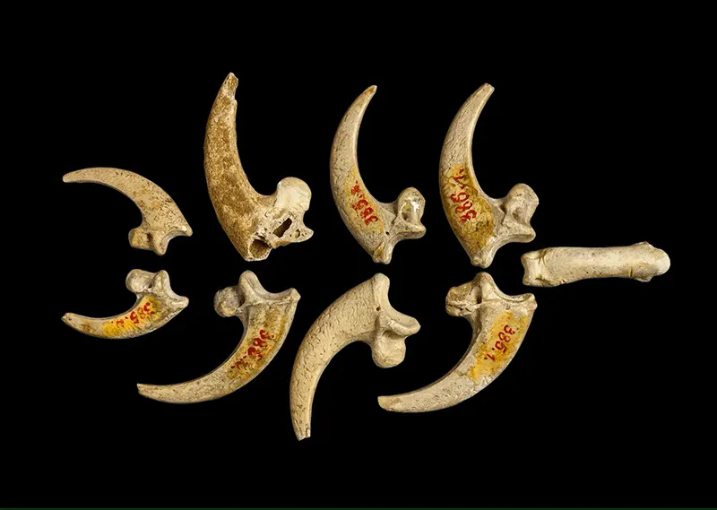 적어도 세 마리의 독수리에게서 발취한 이 발톱은 끈으로 묶기 위해 고안된 복잡한 절단 자국을 보였으며, 꼼꼼한 광택 처리의 흔적을 보여 목걸이나 팔찌의 일부로 사용되었음을 나타냅니다.