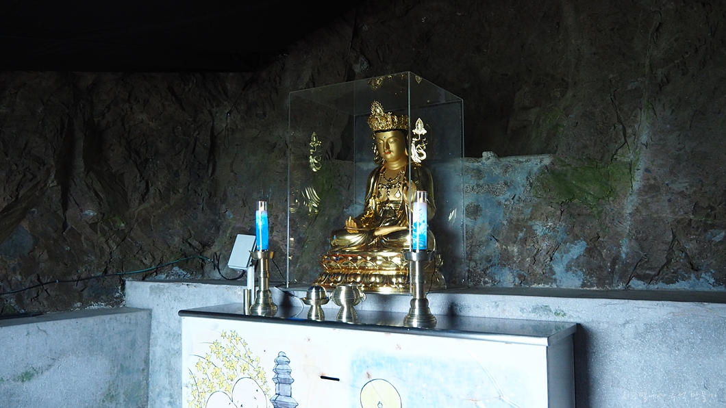 세상을 밝히는 관세음보살이 동굴 속에서 환한 모습으로 앉아 있습니다.