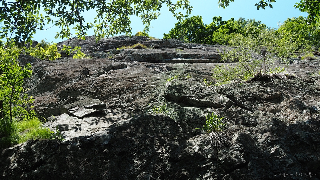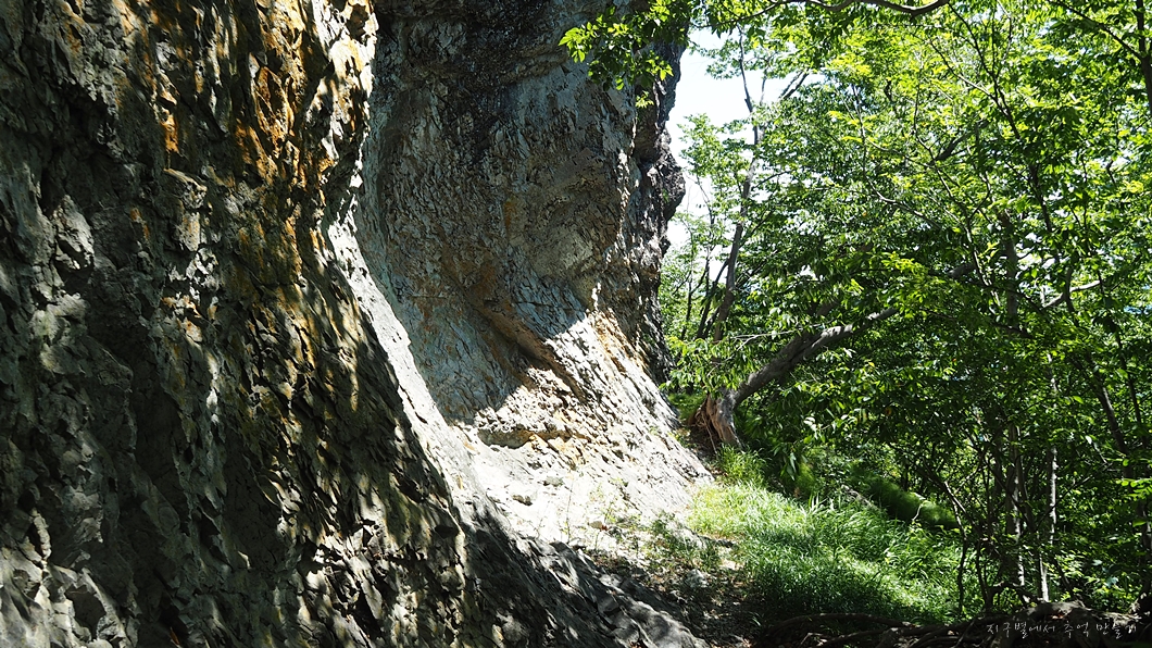 정상의 암봉 절벽 아래를 좌측으로 빙 둘러서 올라갑니다.