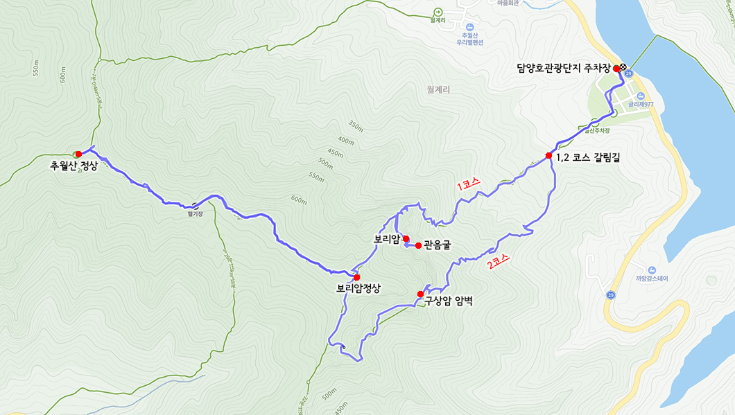 산행 코스 : 담양호 주차장 - 2코스 - 보리암 정상 - 추월산 정상 - 보리암 정상 - 보리암 - 주차장(원점회귀)