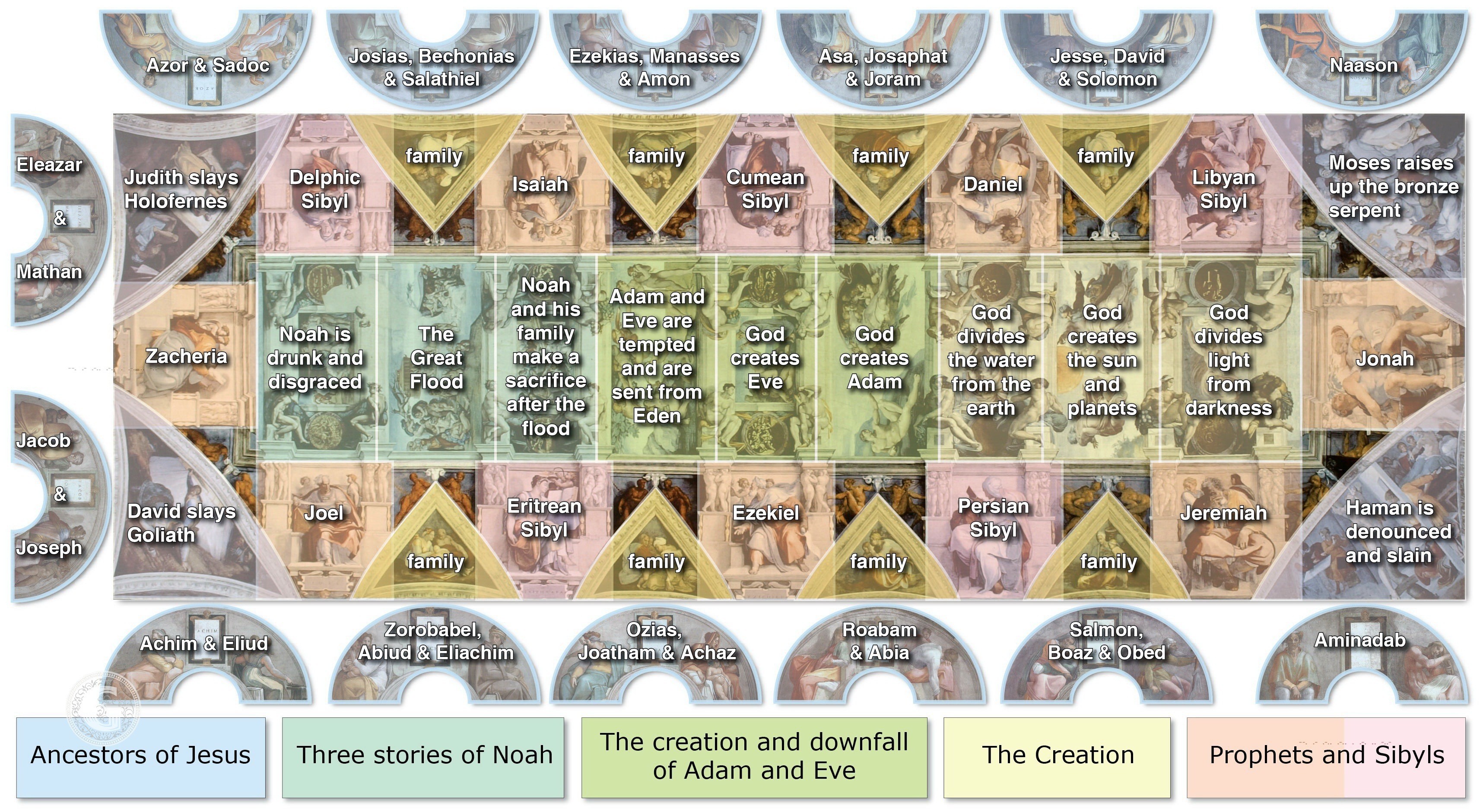 빛과 어둠의 분리(Separation of Light from Darkness), 해와 달의 창조(The Creation of the Sun and Moon), 땅과 물의 분리(Separation of the Earth from the Waters), 아담의 창조(Creation of Adam), 이브의 창조(The Creation of Eve), 원죄와 낙원으로부터의 추방(The Fall and Expulsion from Garden of Eden), 노아의 제물(Sacrifice of Noah), 노아의 대홍수(The Flood), 술 취한 노아(Drunkenness of Noah)입니다.