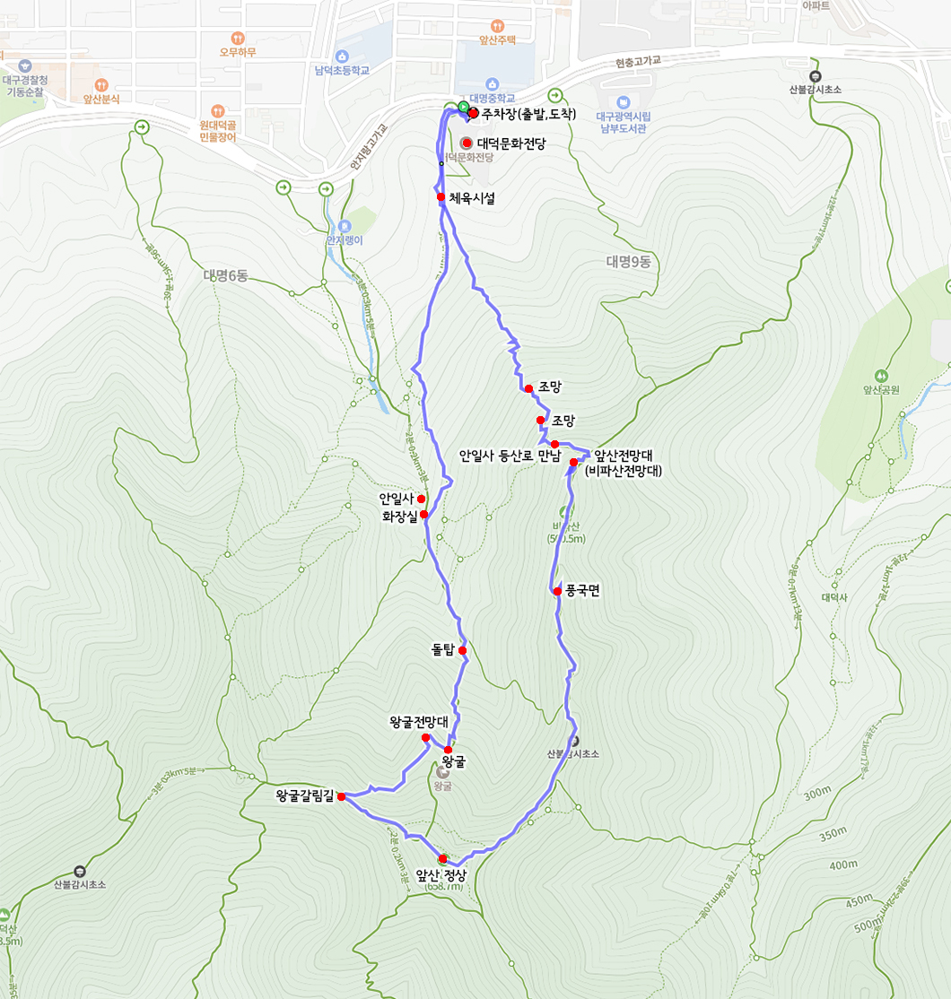 산행 코스 : 대덕문화전당 주차장 - 직등코스 - 앞산전망대 - 앞산정상 - 왕굴전망대 - 대덕문화전당(원점회귀)