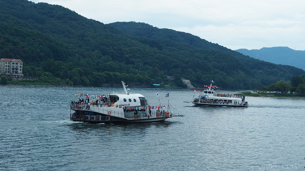 앞쪽에 보이는 섬이 남이섬.
