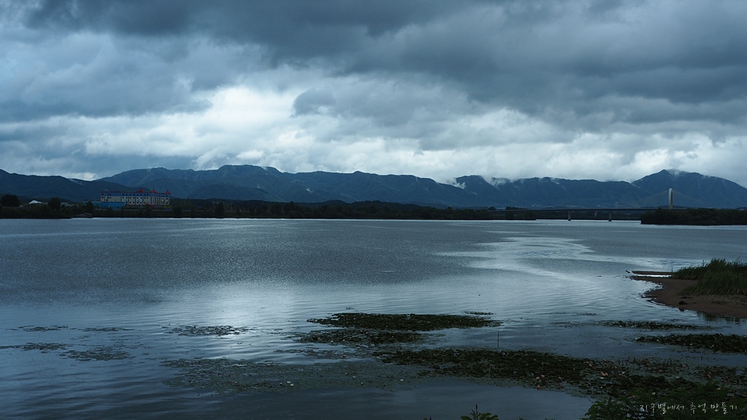 자고 일어나니 호숫가 저편 산들이 그림처럼 보입니다.
