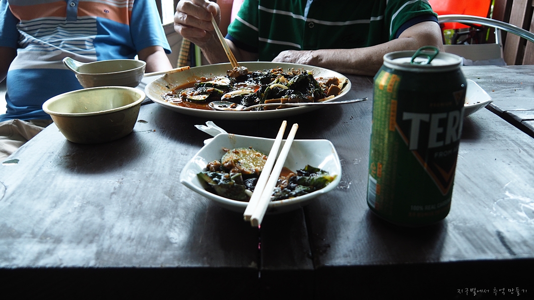 시원한 맥주 한 캔을 완샷으로 마시고 있는데 자꾸 쉬어 가라며 자기들이 새참으로 먹고 있던 묵무침을 건네줍니다.