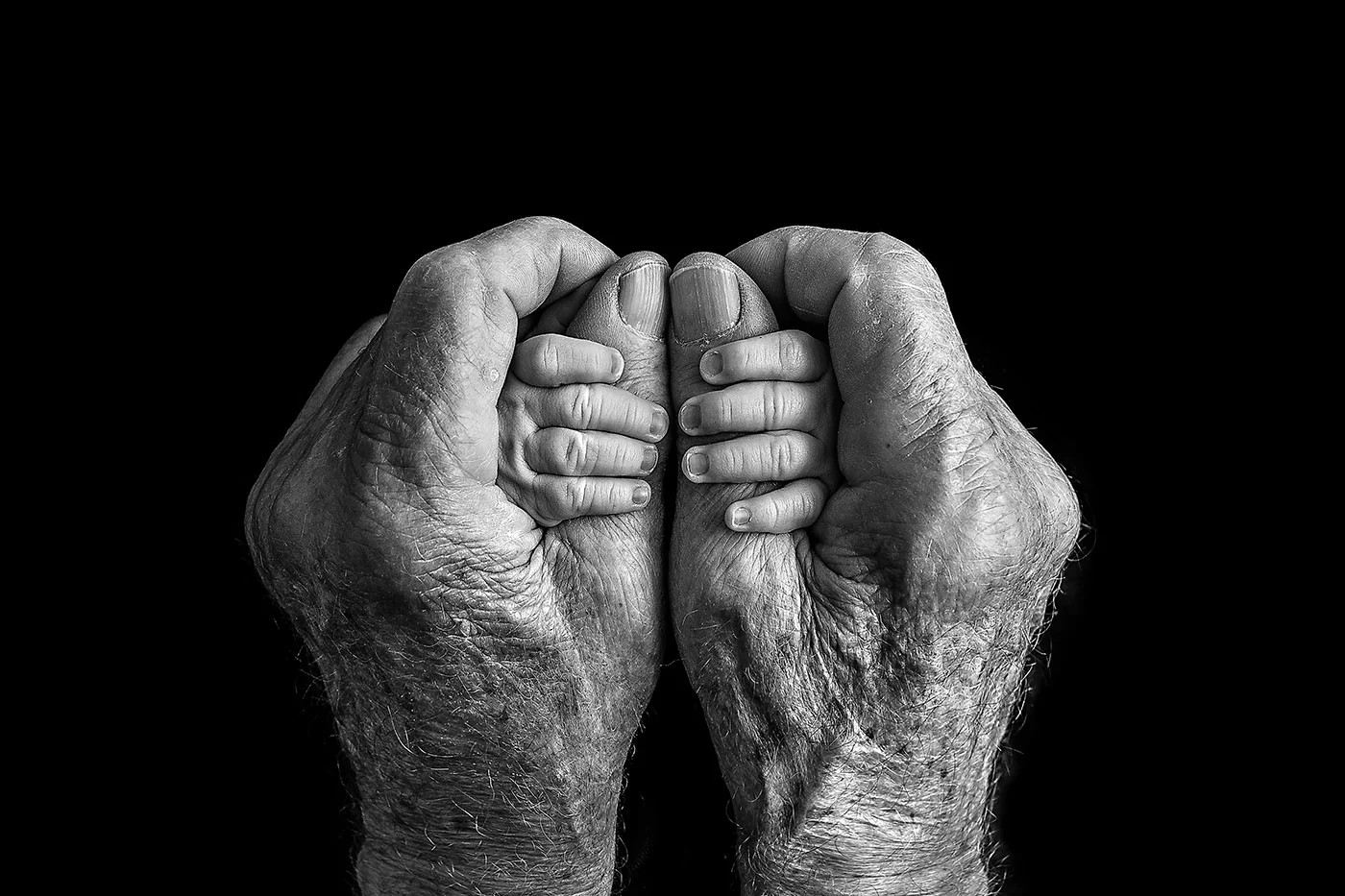 할아버지 손의 주름과 흉터는 평생의 경험과 삶을 말해주고 있는 반면 아기의 부드러운 손가락은 순수함과 호기심을 반영하고 있네요.