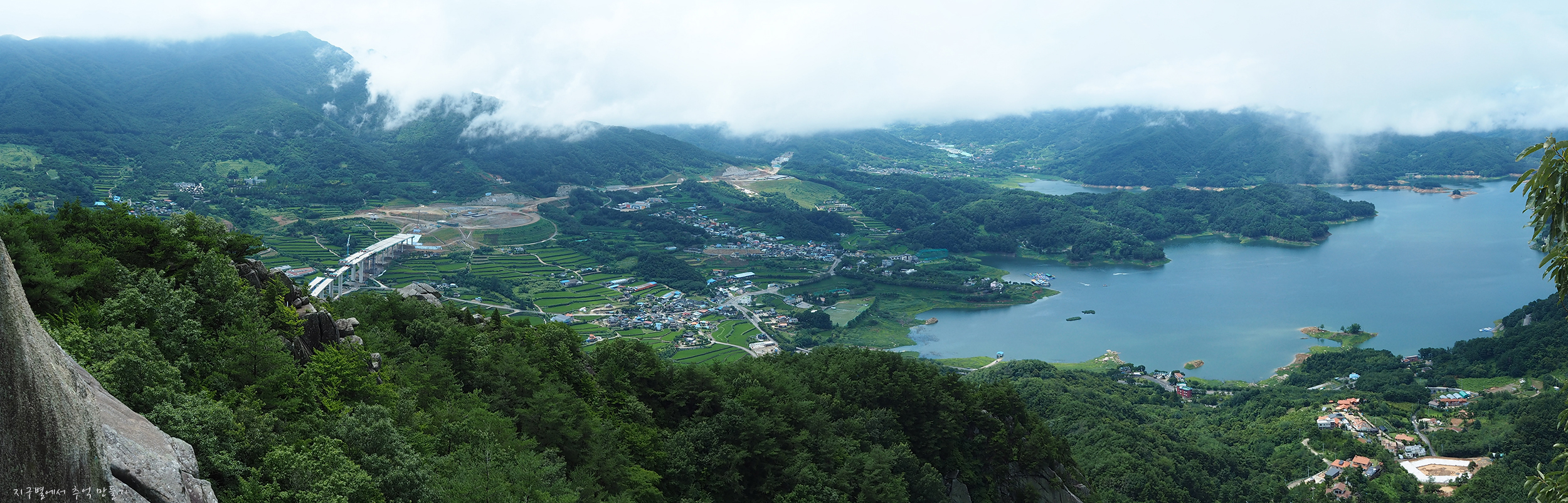 좌측이 운무에 가려진 황매산이고 그 아래 동네가 물속에 잠겼다가 새로 만들어진 대병면 신소재지.