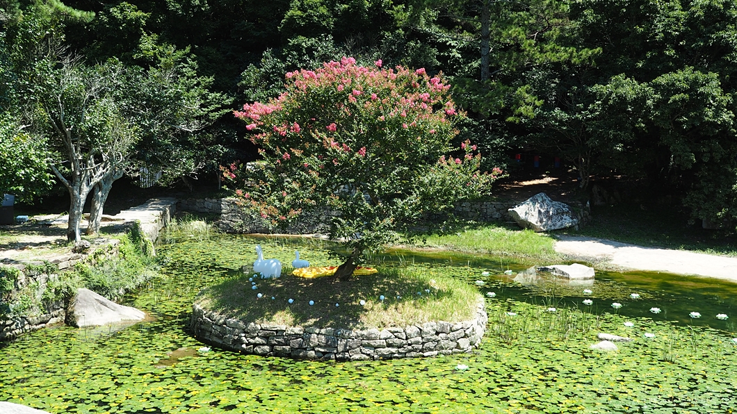 연못 가운데 발갛게 피어있는 목백일홍 꽃.