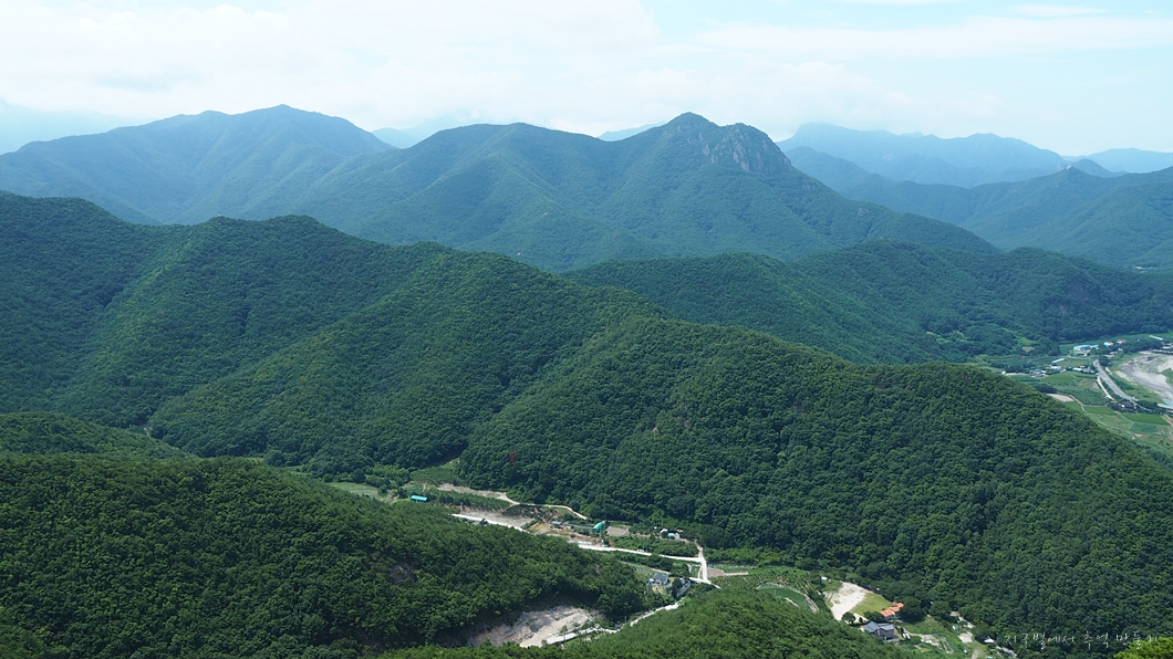 좌측 지룡산과 억산이 보이고 중간에는 까치산과 호거산 방음산의 환 능선이 조망됩니다.